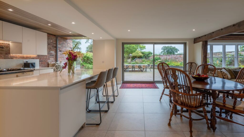 A hand-finished exposed brick wall adds texture and warmth to the kitchen, while a slatted oak ceiling introduces a contemporary rhythm that complements the existing timber beams. These elements now act as focal points within the open-plan space, blending traditional character with modern design.