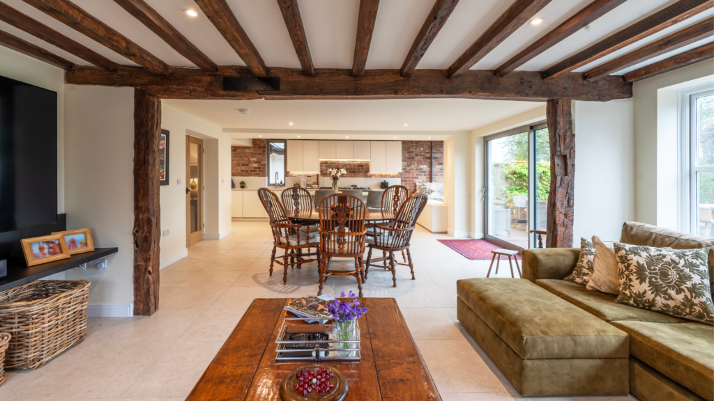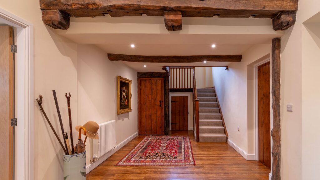 Long, flowing hallways were introduced to improve circulation and visual connections between rooms. From a construction perspective, this involved careful structural alterations while protecting the original fabric of the building. Existing timber beams were retained and celebrated, becoming central features that anchor the new layout in the cottage’s history.
